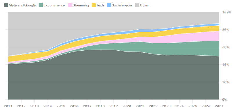 Meta is a massive advertising ecosystem that holds a significant share of the global digital ad market. According to Axios, in 2026 Meta and Google together account for around 50% of the U.S. digital advertising market, with roughly equal shares.