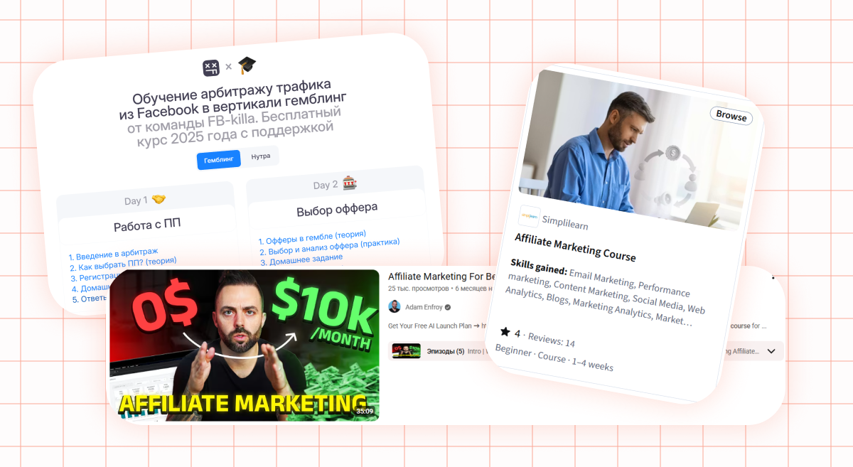 There are terabytes of free educational content about Facebook available online. No one will hand you winning setups, but you can easily learn the ad interface, account farming, and core media buying principles. Affiliate networks and services often run structured training programs with mentors, feedback, and assignments.