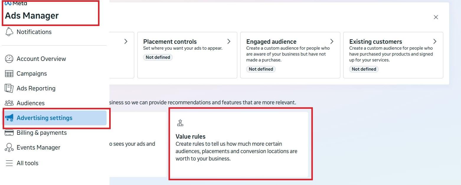 The setup is done directly in Ads Manager. To access the required section, open Ad Settings and find Value Rules.