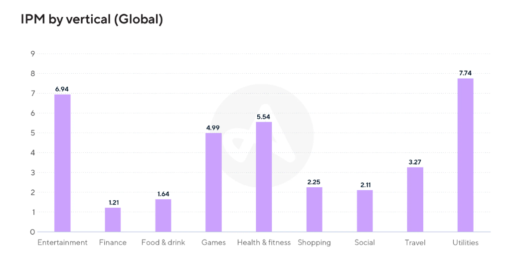 According to 2024 data, on a global level the highest IPM values were shown by utility apps — 7.74. Entertainment apps follow with 6.94. Health & fitness apps demonstrate stable results at 5.54, while mobile games show confident growth and reached an IPM of 4.99.