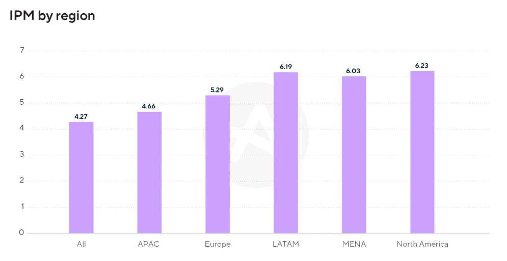 Looking at regions, the global median IPM is 4.27. North America leads with 6.23, which indicates high traffic quality in the region for app promotion.