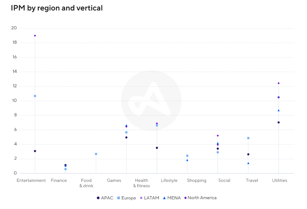 North America holds leading positions across most verticals. Entertainment apps stand out in particular with an IPM of 18.99, as well as utility apps with 12.42. Latin America also shows strong results, with the most notable growth in utilities — 10.48, and mobile games — 6.49.