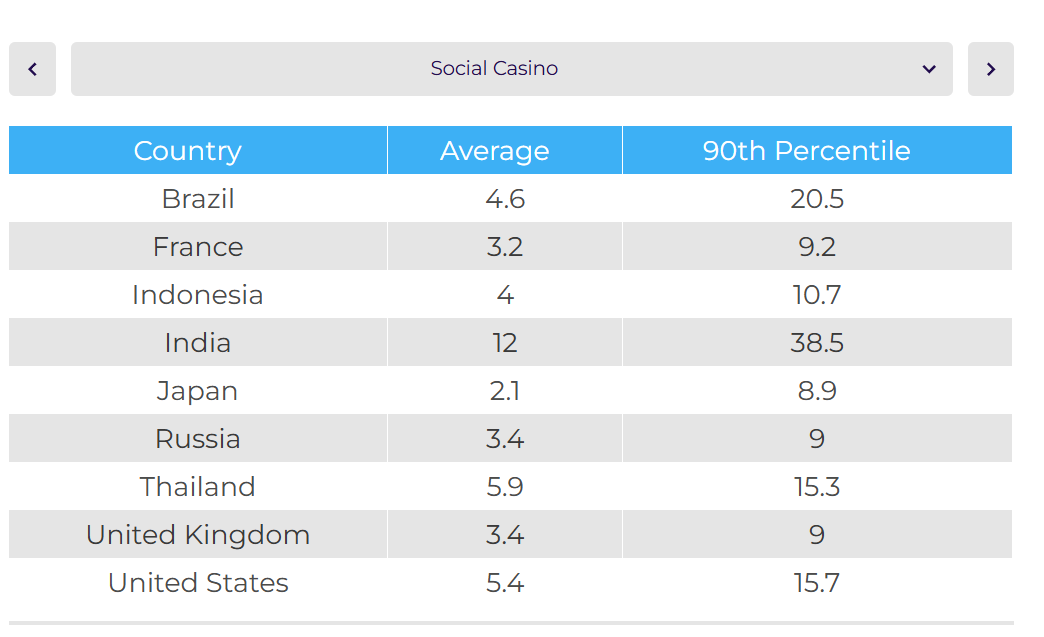 If we look specifically at gaming apps, which are widely used in affiliate marketing, IPM by GEO looks as follows: the highest average values are in India (12), Thailand (5.9), and the USA (5.4), while Japan shows the lowest result at 2.1.